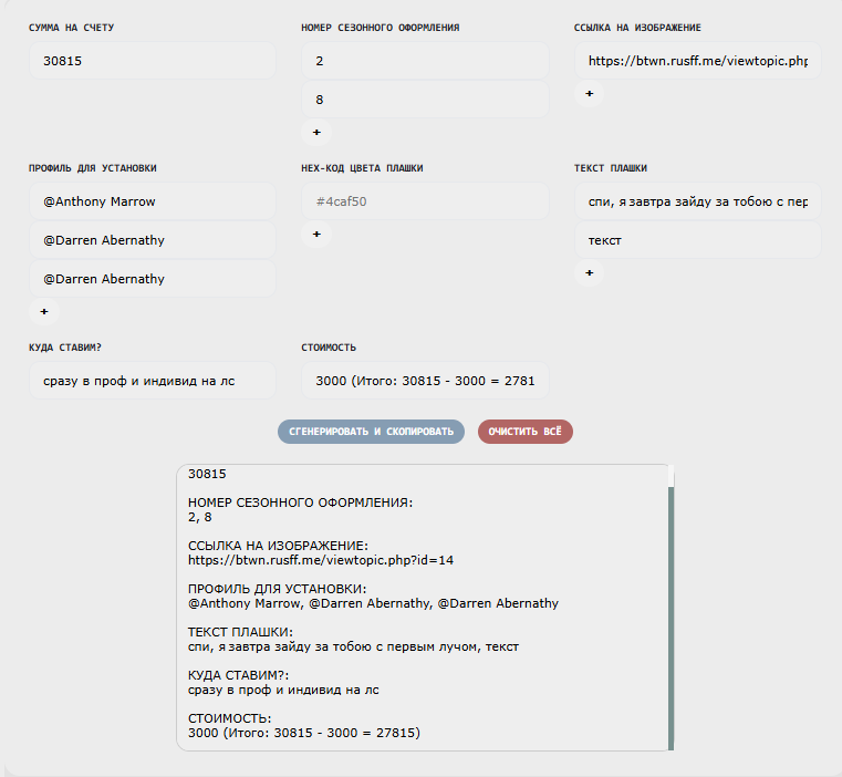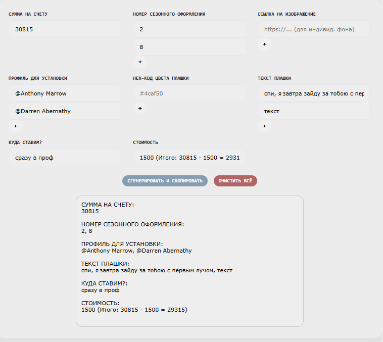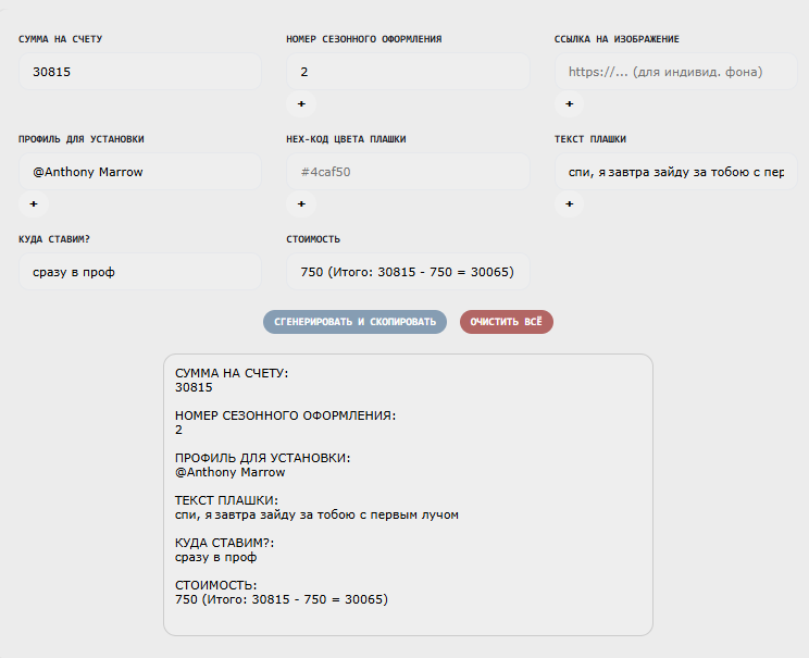 ladies and gentlemen, пришло время наряжаться, потому что в душе мы все принцессы (просто кто-то из нас принцесса на горошине, а кто-то аид). сезонное оформление профиля - в комплект входит фон профиля и плашка [текст для неё вы можете выбрать сами, а можете попросить подобрать администрацию]. сезон длится три месяца и все комплекты лимитированы - то есть, по истечению сезона они больше недоступны к покупке. на данный момент к покупке доступны 14 комплектов [используйте прокрутку]. [html]<body> <div class="gallery"> </body> <style> </script> если ни один из комплектов вам не подошел, есть связи с классным портным из хьюго босс, он снимет мерки и сделает по индивидуальному заказу. [indent] купить сезонное оформление профиля — 750 бит-коинов; чтобы заполнить код, необходимо воспользоваться генератором. коротенькая инструкция к генератору кода: